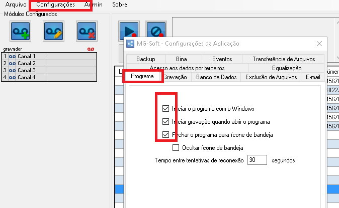 O MG-Soft não roda como serviço. Então é preciso logar no windows primeiro. Quanto a inicialização do software, para que as gravações iniciem automaticamente, na aba programa deve habilitar: "Iniciar programa com o Windows", "Iniciar gravação quando abrir o programa", e "Fechar o programa para ícone de bandeija". Conforme imagem abaixo: https://www.pinaculo.com.br/suporte_upload/MG-4E/inicializacao.png